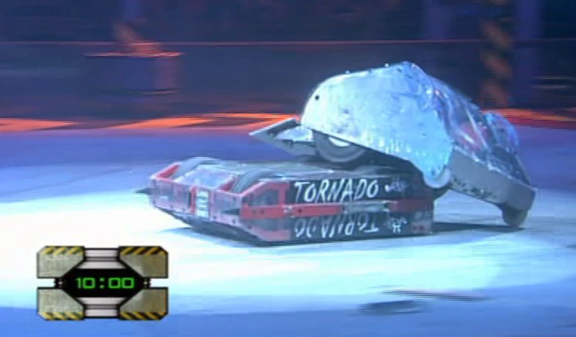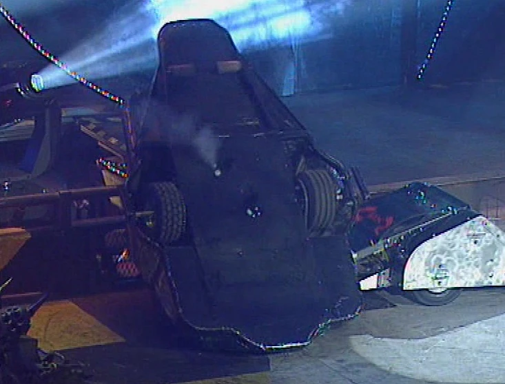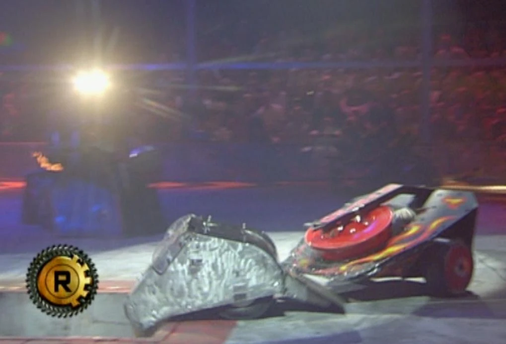 Chaos 2 also fought Tornado in the Challenge Belt. This battle proved to be much of the same as the All-Stars Semi-Final meeting, with Tornado pushing Chaos 2 into the arena side wall. Chaos 2 then threw an incoming Shunt off it with an explosive flip, before rushing out again. Chaos 2 flipped Tornado twice in quick succession, but was rammed into the arena side wall again. Chaos 2 was then attacked by both Shunt and Dead Metal, but Chaos 2 dispatched Shunt with a flip. After escaping Dead Metal, Chaos 2 appeared to have lost mobility on one side, and despite attempting to move around in circles, was counted out by the Refbot, and thrown across the arena by the arena floor flipper, landing on its side, before bouncing back down onto its wheels. However, its working drive motor and flipper mechanism did still work afterwards, having been seen firing it and attempting to move again just before cease was called.
