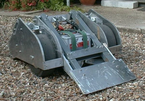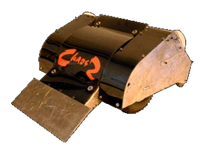 Chaos 2 is a robot from Robot Wars, it competed in Series 3-6 and also both series of Extreme, Chaos 2 was designed and built by self-employed, Ipswich based, mechanic George Francis, and operated by Team Chaos - Francis, joined by Ian Swann and his son Richard. The robot never changed in appearance; a small black wedge robot armoured in aluminium and polycarbonate and was often considered a role model for any designs featuring flippers and even a role model for Robot Wars. It was armed with a powerful high pressure pneumatic flipper driven off liquid CO2 produced in a fire extinguisher to drive the twin pneumatic rams at the base, expanding at 570/1. The robot itself also had superb traction, a low centre of gravity, two-wheel drive, a zero turning circle and 20mph top speeds driven by a pair of lawnmower motors; in total, the whole robot cost only £250 to build. It used several parts, such as the wheels, casters and differentials from its predecessor Chaos, much like how Chaos had utilised parts from its own predecessor, Robot the Bruce.