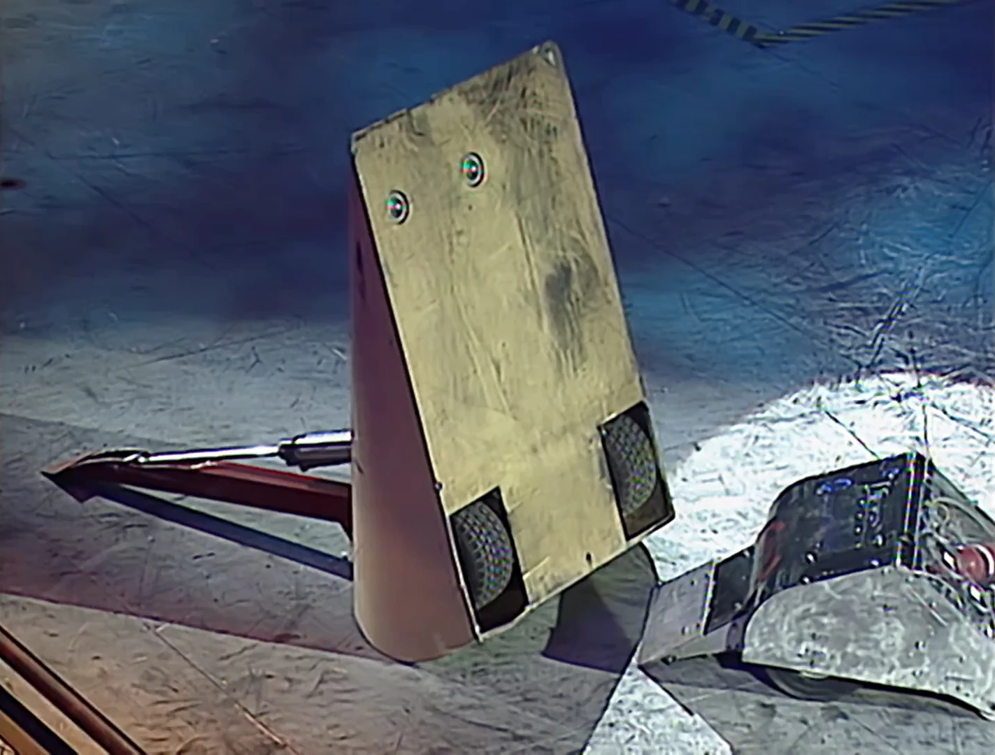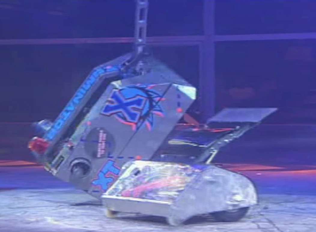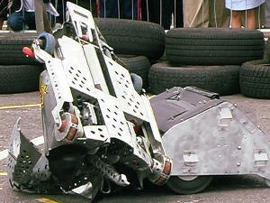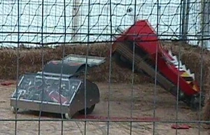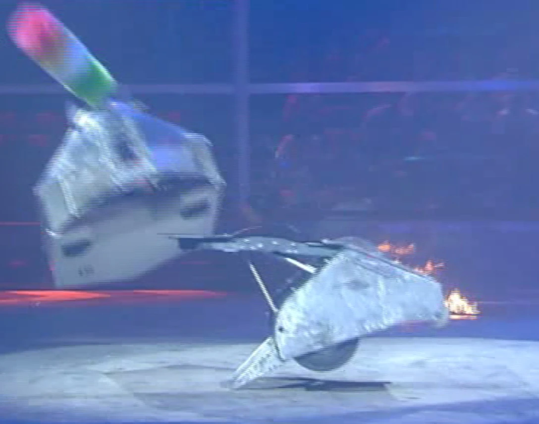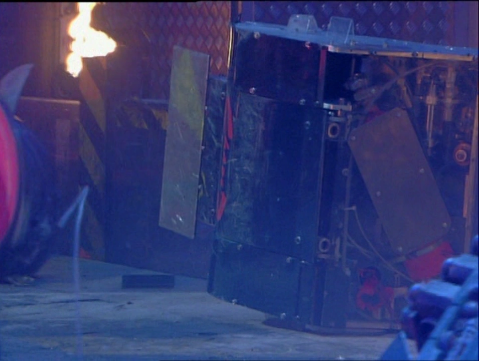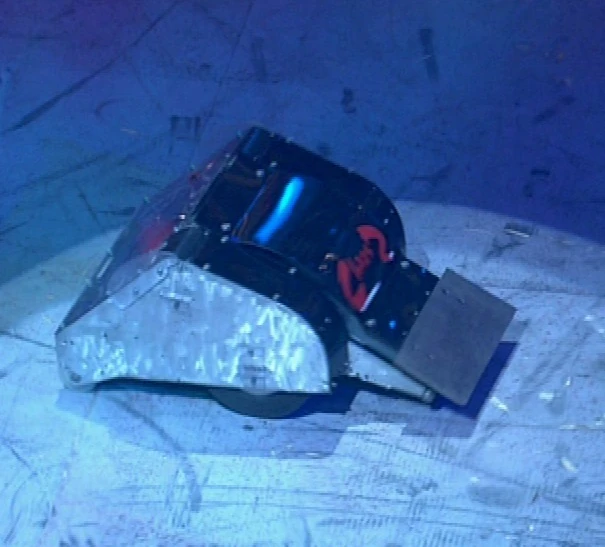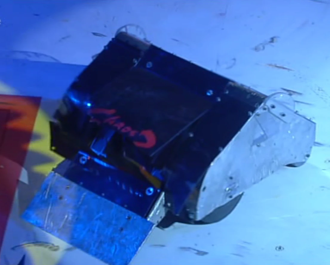 The reigning champions and number 1 seeds Chaos 2 had a fairly easy heat in the Fourth Wars. The robot was placed in Heat A of the main competition, and its first round battle consisted of two newcomers to the main competition: Indefatigable and Atomic. In the battle, Chaos 2 managed to flip Atomic onto its side immediately, with the latter just about managing to self-right. Chaos 2 then headed for Indefatigable, flipping it onto its side as well. Indefatigable was unable to self-right, and was declared immobilised. To celebrate this success, Chaos 2 continued its battle with Atomic, flipping it into the arena side wall (hitting the camera in the process), and then onto its back, from which it couldn't self-right. Chaos 2 then decided to continue fighting Indefatigable, bringing it up to the arena side wall, and flipping it out of the arena, putting it through to the next round of the heat.