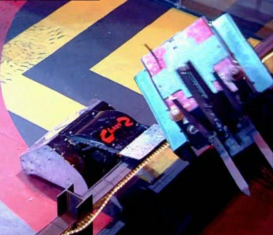Heat E of the Third Wars was Chaos 2's very first televised appearance, and its first steps into Robot Wars history. In the first round of the heat, Chaos 2 was placed up against newcomers to the main competition in Crocodilotron. In the battle, Chaos 2 started much faster than Crocodilotron, which sluggishly ran away from it. Chaos 2 caught up with its opponent very quickly, and then got in underneath Crocodilotron, and flipped it up and over, into Matilda's CPZ, before flipping it again into the arena side wall, closer to the arena corner. Chaos 2 then tried another charge, seemingly trying to thrust Crocdilotron out of the arena, however, the house robots intercepted Chaos 2. Chaos 2 then lightly flipped Matilda, and broke the house robot's chainsaw chain as a result. Eventually, Sergeant Bash was able to control things by grabbing Chaos 2 with its jaws, and pinning it up against the arena side wall, whilst Dead Metal finished off the remains of Crocodilotron. Chaos 2 subsequently went through to the next round of the heat. A similar battle ensued, as Chaos 2's second round opponent was Team Power's Sonic machine. In the battle, Sonic proved much more cautious than Crocodilotron, however, that didn't stop Chaos 2 flipping Sonic clean over almost straight away, from which Sonic could not move. However, to keep the battle going, Chaos 2 righted Sonic, only to flip it over again, Chaos 2 didn't right it this time. Chaos 2 then retreated to the distance, as the house robots pitted Sonic. Chaos 2 was then put through to the third round of the heat. Chaos 2 reached the heat final, only to be placed up against the other favourites of the heat, The Big Cheese.