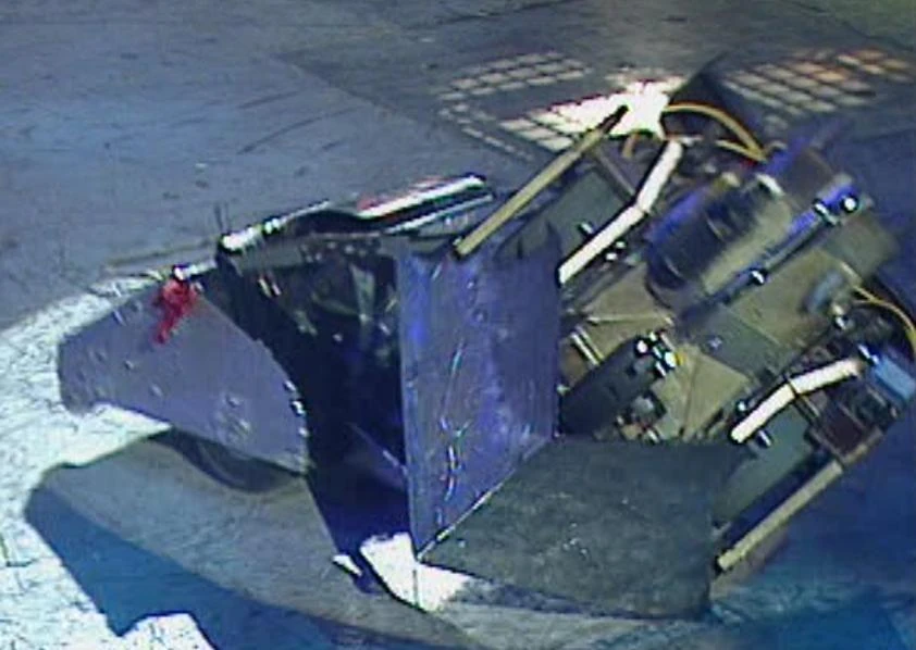 Both robots had hesitant starts in this battle, and The Big Cheese got in underneath Chaos 2 and lifted it up, where the latter lay on its side briefly, before coming back down onto its wheels.