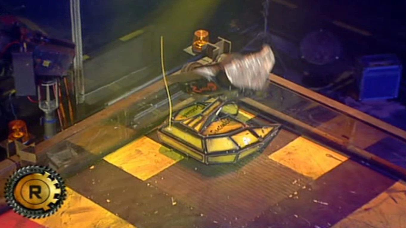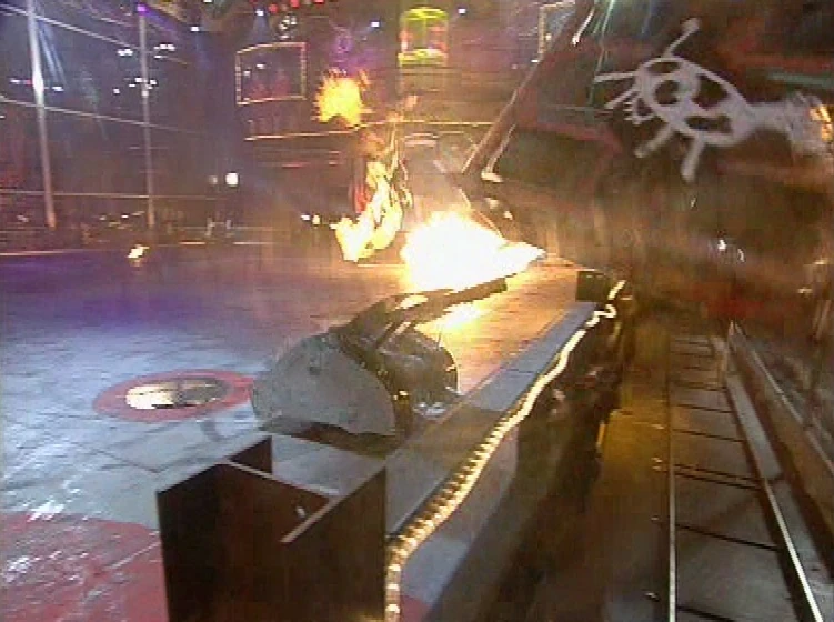 The Grand Final for the Third Wars kicked off with a battle between Chaos 2 and Fire Storm. In the battle, neither machine could get in underneath the other, so they merely bashed into each other a few times. But then, Chaos 2 found an opening as Fire Storm drove across Chaos 2's flipping range. Fire Storm paused, as it was on the wedge of Chaos 2's flipper, even though the wheels of Fire Storm were still turning, Chaos 2 took advantage of this and flipped Fire Storm onto its back as a result. Before Fire Storm could self-right, Chaos 2 pushed it over to the arena side wall and flipped it out of the arena, the first Out-of-the-Arena (OotA) in Robot Wars history. This victory put Chaos 2 through to the Grand Final. Afterwards, George Francis said this was an accident as he was originally only intending to slam Fire Storm into the arena side wall.